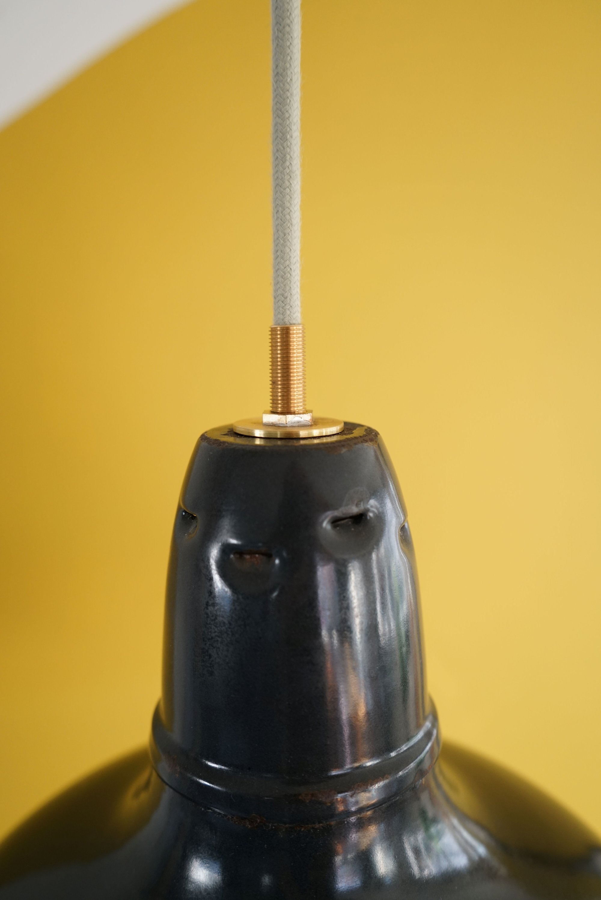 Durchmesser: 350 mm Höhe: 270 mm Material: Emaillierter Metalllampenschirm Farbe: Antrazit Fassung: E27 aus Messing/Kupfer und Keramik Kabellänge: 2 m Kabelfarbe: Salbei