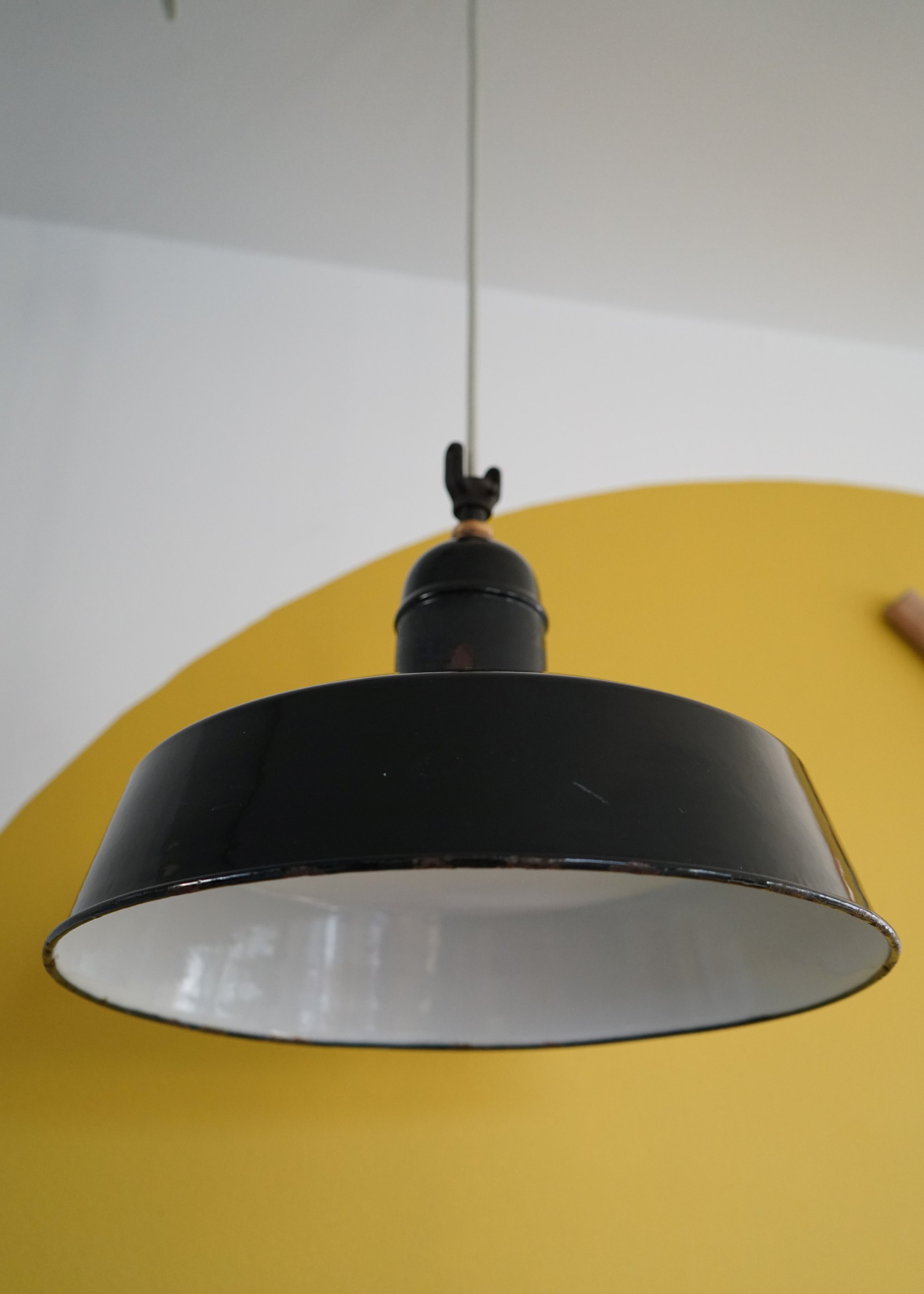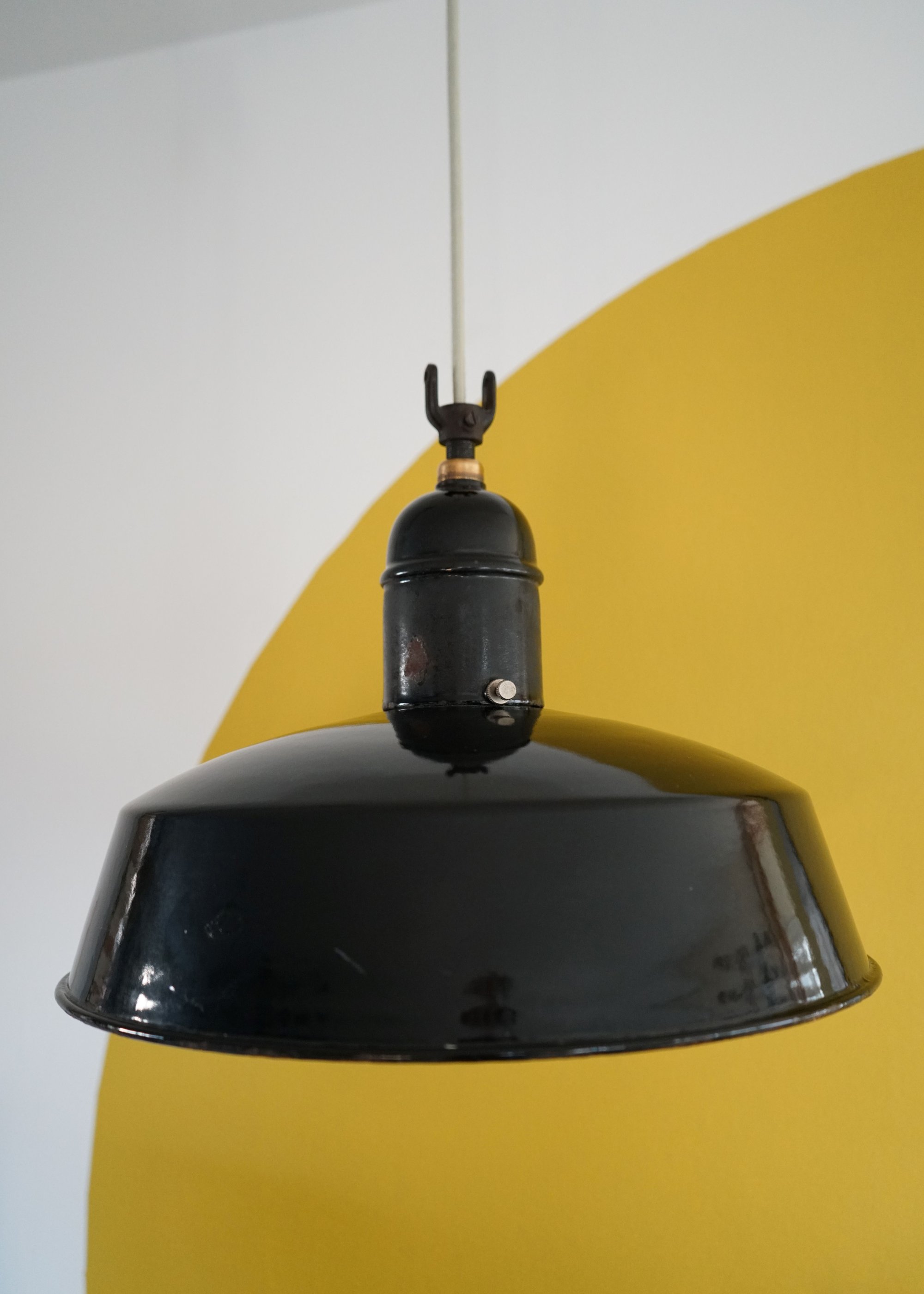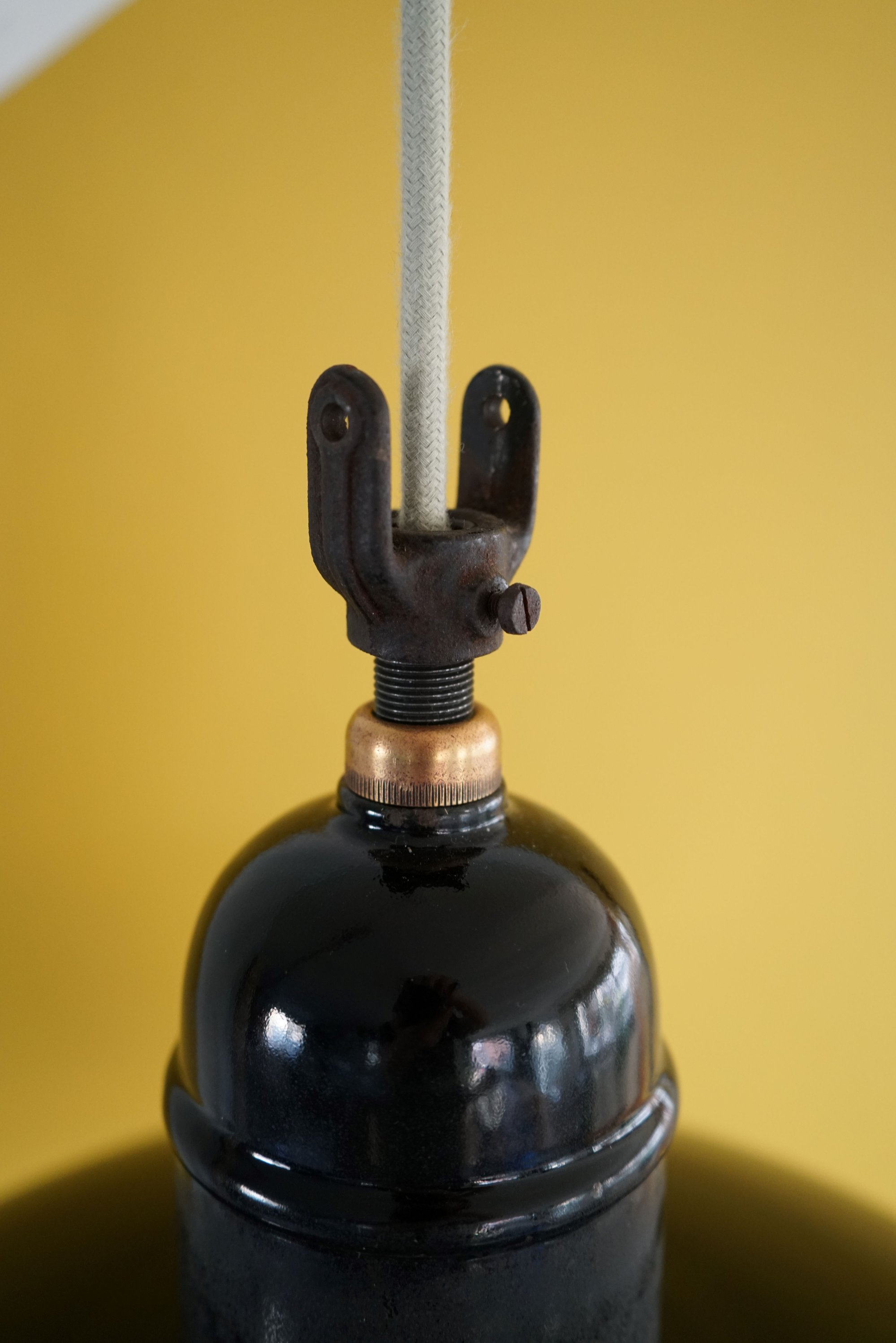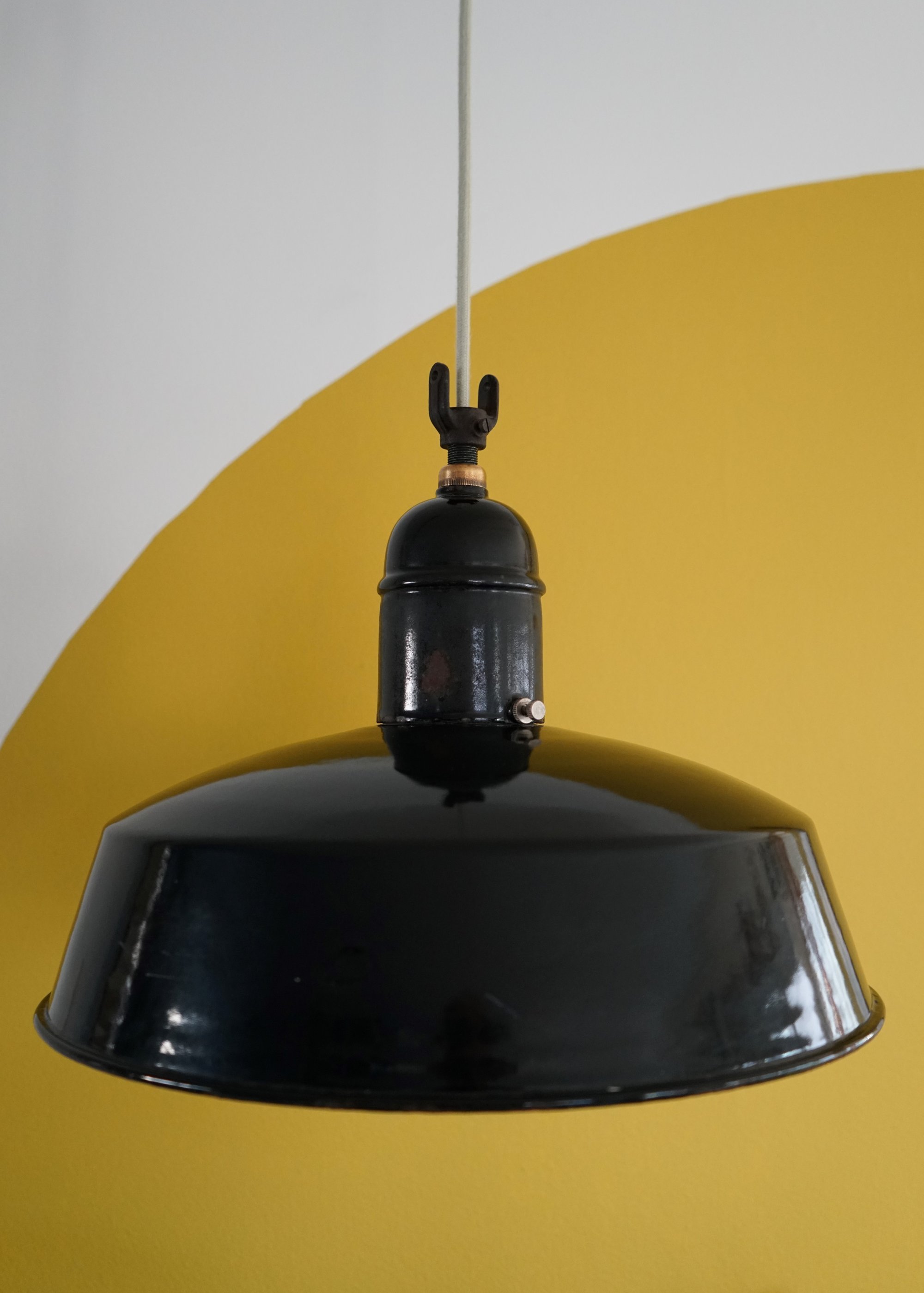 Durchmesser: 420mm Höhe: 370mm Material: Emaillierter Metalllampenschirm Farbe: Schwarz Fassung: E27 aus Messing/Kupfer und Keramik Kabellänge: 2.9 m Kabelfarbe: SalbeiMit extra Zugentlaster für Montage
